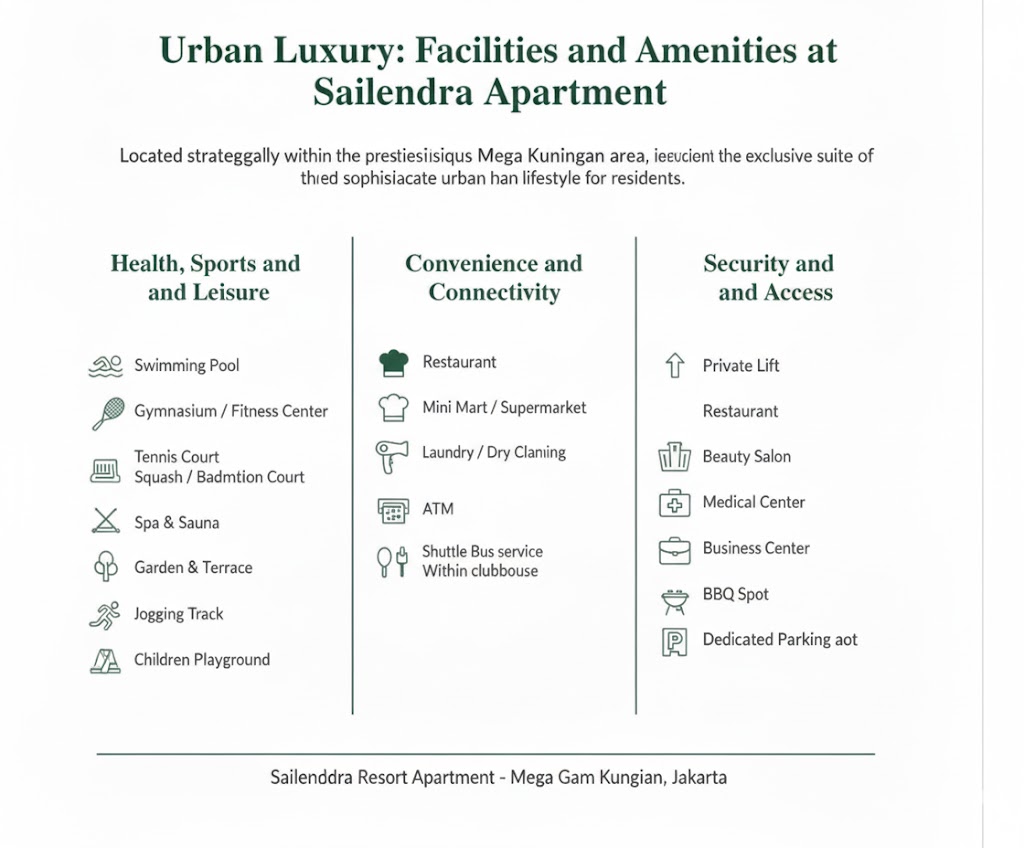 Located strategically within the prestigious Mega Kuningan area, Sailendra Apartment offers an exclusive suite of amenities designed to support a luxurious and convenient urban lifestyle for its residents.