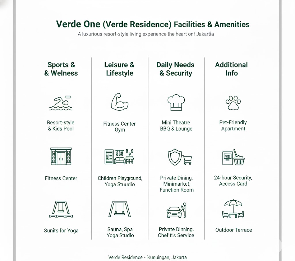 Verde One (Verde Residence) provides a wide range of premium facilities and amenities designed to support a luxurious, resort-style living experience in the heart of Jakarta: